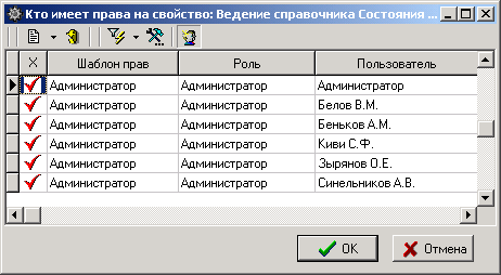 имеет доступ» выводит списков ролей и/или пользователей, кому это право