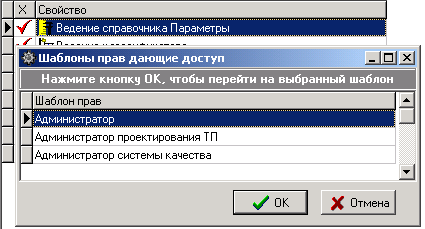 Здесь показано, в каких шаблонах прав задействовано право «Ведение справочника Параметры». Установка курсора на любую из записей этого списка и нажатие кнопки «ОК» позволяет перейти на данный шаблон прав.