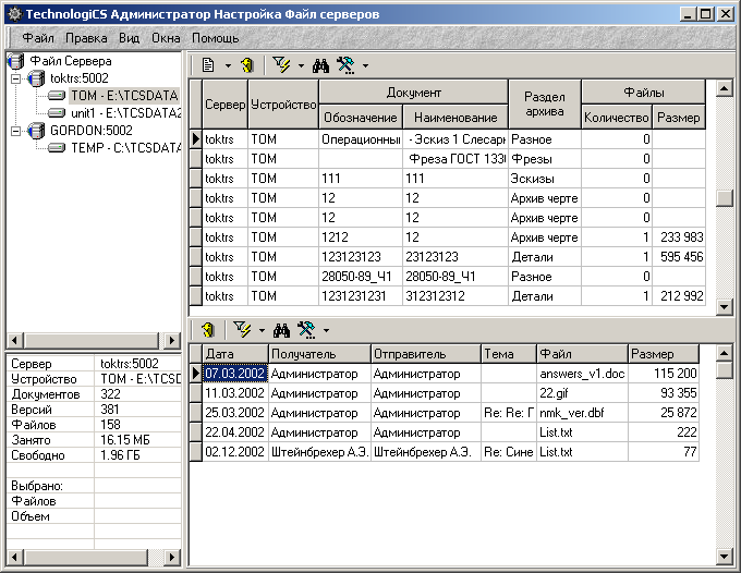 Файловый сервер системы предназначен для работы с файлами и обеспечения доступа к ним со стороны клиентской части системы документооборота. Файловый сервер и клиентская часть обмениваются между собой, используя TCP пакеты, что обеспечивает защищенное хранение файлов документов (обычными средствами получить доступ к файловому хранилищу невозможно, если это не сделано специально).