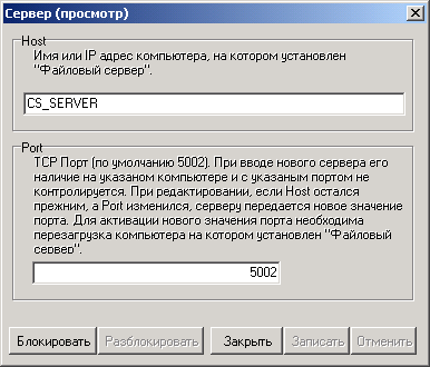 Для того чтобы изменить значения «Host» и «Port» файлового сервера предварительно нужно выполнить операцию блокирования. Для этого следует нажать кнопку «Блокировать». Если блокирование прошло успешно, то возможно изменение этих значений. При этом, кнопка «Разблокировать» становится доступна, а кнопки «Блокировать» и «Закрыть» – недоступны. Если значения полей изменены, то становятся доступны только кнопки «Записать» и «Отменить». Нажатие «Записать» сохраняет новые значения, а «Отменить» возвращает предыдущие. Если началось редактирование, разблокировать сервер невозможно.