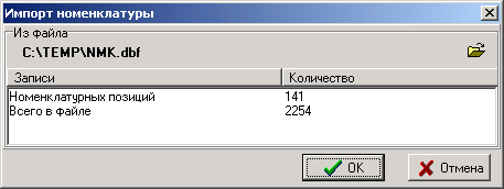 При успешном открытии файла в нижней части окна выводится диагностика о количестве номенклатурных позиций и количестве записей в базе данных. При нажатии кнопки «ОК» выдается диалоговое окно следующего вида: