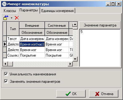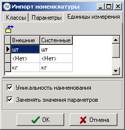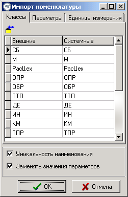 На закладке «Параметры» производится сопоставление списка импортируемых и системных параметров, при этом выводится окно следующего вида: