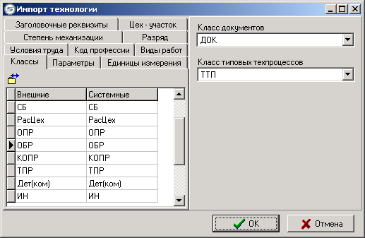 На закладках «Единицы измерения», «Заголовочные реквизиты», «Цех-участок», «Степень механизации», «Разряд», «Условия труда», «Код профессии», «Виды работ» проводится сопоставление значений, находящихся во внешней базе, с системными (введенными в базу данных) значениями. Если это соответствие не установлено, импорт техпроцессов невозможен. Исключение составляет справочник цехов-участков, который при импорте пополняется значениями из внешней базы данных.