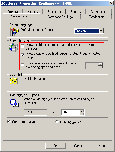Наиболее критичные настройки SQL сервера приведены ниже (выделены красной рамочкой):