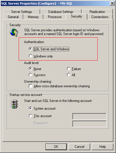Windows Authentication – использовать проверку прав SQL сервером или доменом