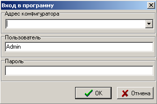 При первом запуске необходимо зайти под пользователем Admin с пустым паролем. В дальнейшем имя конфигуратора, имя пользователя и пароль можно будет изменить.