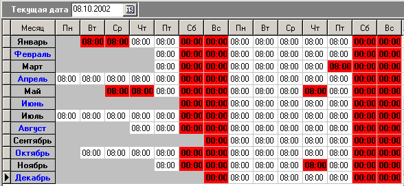 В данном окне показаны месяцы и дни недели. Для каждого дня указана его продолжительность в часах, которую в этом окне можно исправить. Выходные и праздничные дни показаны красным цветом.