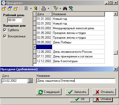 В данном окне указывается продолжительность рабочего дня, выходные дни недели (суббота, воскресенье) и перечень праздников, предстоящих в течение года.
