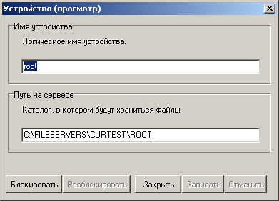 Для сохранения внесенных изменений нажмите кнопку «Разблокировать». Параметрами устройства являются его логическое имя (произвольное) и путь на сервере до папки в которой будут храниться данные.