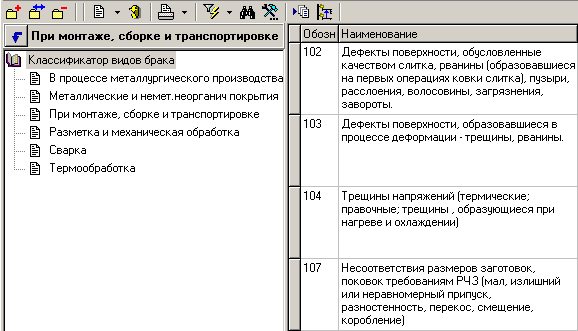 В левой части находится дерево классификатора, в правой части справочника показан перечень видов брака. Для различных видов производства данный справочник составляется в соответствии с принятой нормативной документацией и служит для учета брака в подсистеме управления производством.