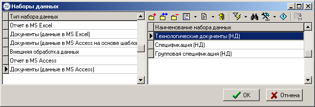 Левая часть окна содержит список возможных типов наборов данных (см. главу 14.9.1). Правая часть окна отображает список настроенных наборов данных выбранного типа.