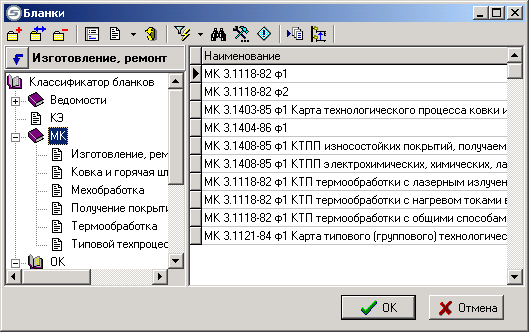 В поле «Класс» из списка классов выбираем «КОПР». В поле «Наименование бланка» из списка бланков выбираем «ОК 3.1502-85 ф2 Операционная карта технического контроля».