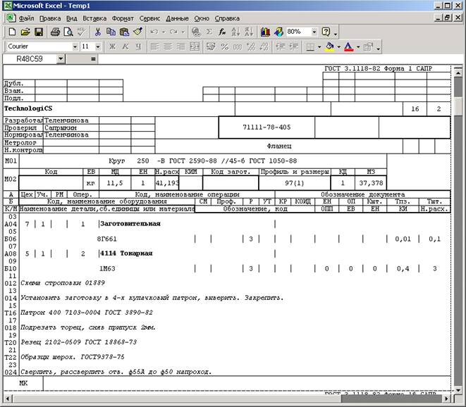 Сформированный выходной документ представлен в виде одного или нескольких листов MS Excel.