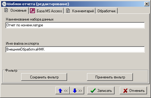 Имя файла экспорта используется при экспорте шаблона базы данных, определенной на закладке «База MS Access». А также при сохранении базы данных во внешний файл система предлагает задать ей это имя. При загрузке базы данных из внешнего файла имя файла экспорта автоматически изменяется на имя загружаемого файла. Имя файла экспорта должно быть уникальным.