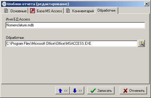 На закладке «Обработчик» в реквизит «Имя БД Access» указывается имя файла создаваемой системой базы данных MS Access, а в реквизит «Обработчик» - наименование внешнего приложения.