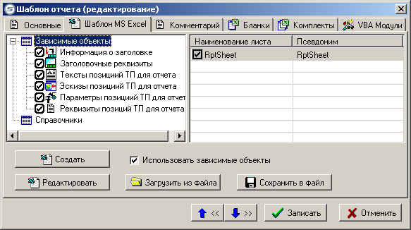 Если флаг «Использовать зависимые объекты» установлен, то нажатие кнопки «Создать» запускает процесс создание шаблона на основе зависимых объектов, имеющихся в текущем режиме системы.
