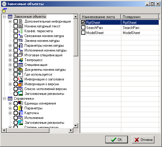 Левая часть окна содержит список зависимых объектов и список справочников, существующих в системе. В данном дереве необходимо отметить те позиции, которые нужно включить в формируемый набор данных.