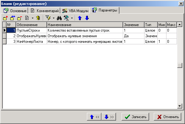 Список параметров для бланка ведется на закладке «Параметры».