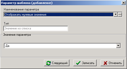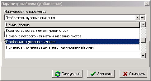 При добавлении в список новой записи из справочника «Параметры шаблонов» выбирается нужный параметр и вводится его значение.