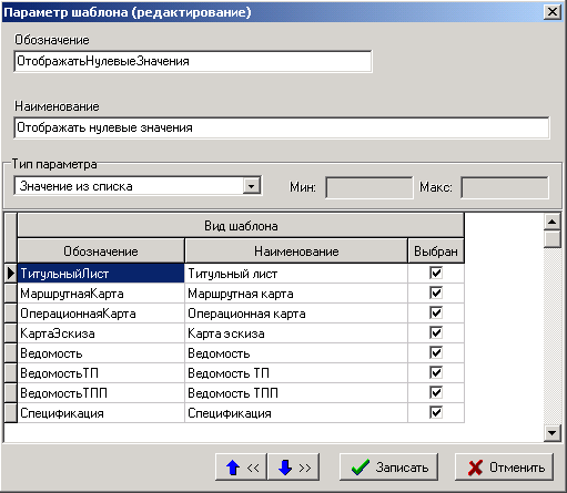 Так, например, для вида шаблона «Титульный лист» в списке будут отображены только те параметры, у которых в справочнике «Параметры шаблонов» для этого вида установлен флаг «Выбран».