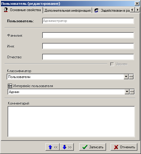 На закладке «Основные свойства» заполняются поля «Фамилия», «Имя», «Отчество», «Комментарий», «Классификатор», к которому будет относиться данный пользователь и «Интерфейс пользователя», который будет назначен пользователю при старте системы, как это показано в разделе16.2.