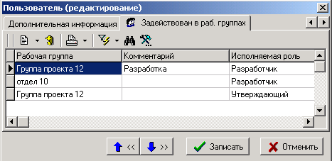 На закладке «Задействован в раб. группах» выдается информация, в каких рабочих группах участвует пользователь.