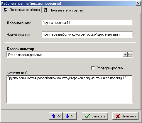 На закладке «Основные свойства» задается обозначение и наименование рабочей группы, классификатор групп, куда она относится и комментарий к ней (любая поясняющая информация).