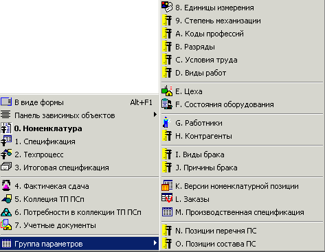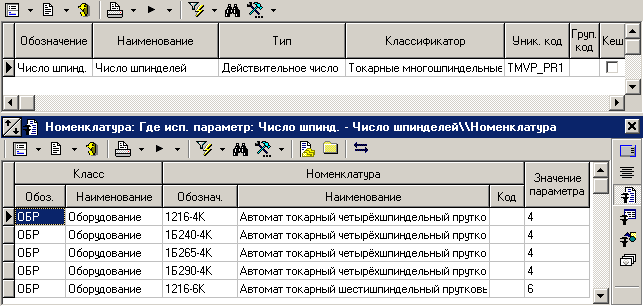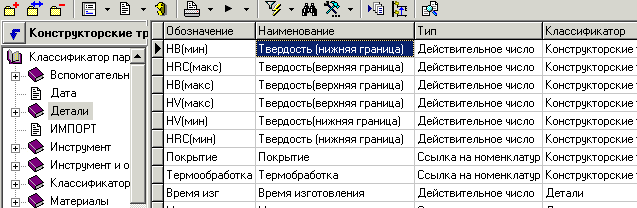 В системе используются различные виды параметров. Это параметры номенклатуры, которые вводятся вместе с номенклатурными позициями и в последствии не изменяются (например, угол заточки резца или количество зубьев фрезы), и параметры позиций документов, которые у каждого техпроцесса, спецификации или любого другого документа свои (например, сварочные токи, режимы резания или группировки позиций спецификации). И те и другие параметры хранятся в одном вспомогательном справочнике, структурированном в виде дерева. Доступ к данному справочнику осуществляется из раздела