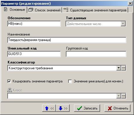 Для того чтобы в системе осуществлять быстрый поиск по значениям параметров (см. например 3.7) необходимо установить флаг «Кэшировать значение параметра», после чего имеющиеся в системе значения параметра будут помещаться в специальную таблицу, из которой в последствии они и будут выбираться. Данная таблица находится на закладке «Существующие значения параметров».