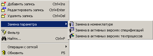 Для удобства работы в справочнике, наряду с основными режимами работы, описанными в разделе 1.4, предусмотрен режим «Замена параметров». Его удобно использовать, когда в систему импортируется значительное количество данных из других систем (номенклатурных справочников или техпроцессов) которые содержат параметры такие же по смыслу, но отличающиеся по обозначениям от параметров, принятых при настройке данной системы. Для того чтобы быстро заменить одни параметры в системе на другие и служит режим «Замена параметров».