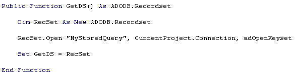 НаименованиеФункции – наименование пользовательской функции, которая должна находиться в общем модуле базы данных MS Access и описана с ключевым словом Public. Данная функция должна возвращать объект Recordset (библиотеки ADO) с типом курсора Keyset.