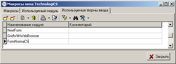 Закладка «Используемые формы ввода» может иметь несколько модулей (форм), содержащих описания расположенных в них визуальных компонентов и кода по работе с ними. Код формы содержит также ряд предопределенных обработчиков событий. В коде формы действуют те же самые правила, что и в обычном скрипте.