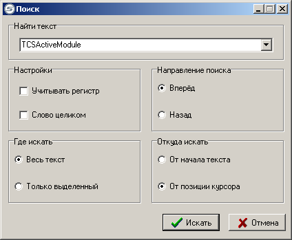 В поле «Найти текст» этого диалога следует ввести образец для поиска. При открытии диалога в данное поле автоматически заносится слово, в котором в данный момент находится курсор.