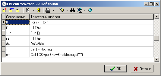 В реквизит «Текстовый шаблон» записывается текст, который будет соответствовать указанному «сокращению». Символ «|» в тексте шаблона используется для указания места, куда необходимо установить курсор, когда «сокращение» будет заменено на текстовый шаблон.