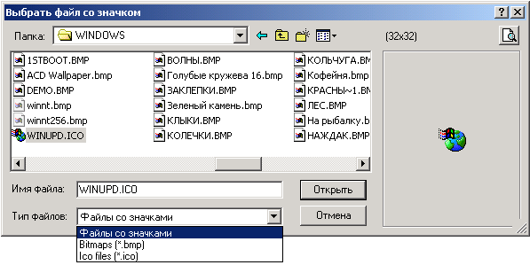· «Добавить значок» и «Редактировать значок»: в этом случае выдается диалоговое окно, в которое выводится список файлов со значками (.bmp, .pic). В этом списке следует выбрать файл для загрузки в список.