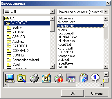 · «Добавить из файла со значками» и «Взять из файла со значками»: в этом случае выдается диалоговое окно, в которое выводятся все исполняемые файлы (.exe, .dll). При навигации по списку отображаются значки, содержащиеся в них. Из списка следует выбрать нужный и после двойного нажатия на левую кнопку мыши по значку, он загружается в список.