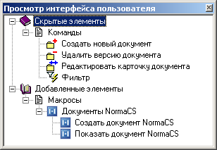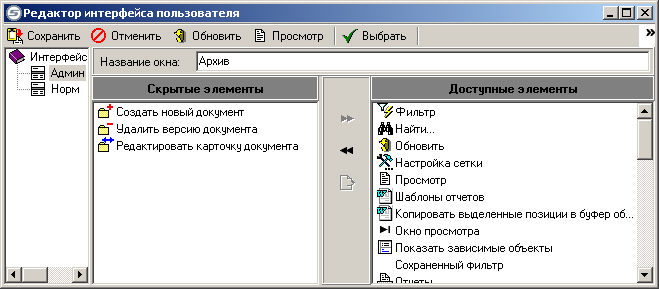 В рабочей области отображаются окна «Скрытые элементы» и «Доступные элементы». Настройка интерфейсов осуществляется переносом элементов между этими окнами двойным щелчком мыши по элементу или нажатием соответствующей кнопки рабочей области: