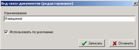В поле «Наименование» вносится наименование вида связи документа. Флаг «Использовать по умолчанию» устанавливается для вида связи, который будет автоматически выбираться при добавлении новой записи в список связанных документов, а так же во время выполнения действия при переходе «Создать связанный документ».