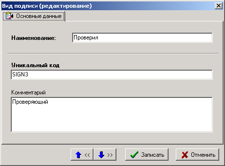 В поле «Наименование» вводится наименование подписи, в поле «Комментарий» - любая поясняющая информация, а в поле «Уникальный код» - уникальное обозначение вида подписи.
