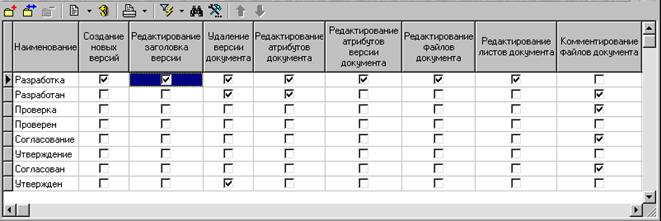 Эти права накладывают ограничения на права доступа к конкретному документу, установленные пользователю, т.е. если пользователь имеет право редактировать атрибуты, а статус документа это запрещает, то редактирование значений атрибутов будет запрещено. Если в статусе отсутствует право создания новой версии, а переход из состояния в состояние его требует, то новая версия создается. О правах доступа к документу см. «Шаблоны прав».