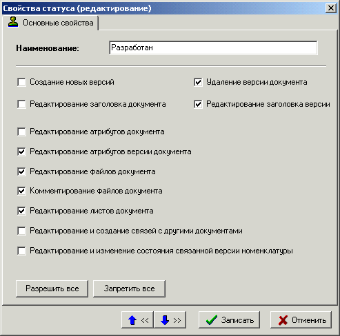 Каждый статус кроме наименования определяется еще и набором действий, которые можно производить над документом, имеющим данный статус. При добавлении или корректировке статуса выводится окно следующего вида: