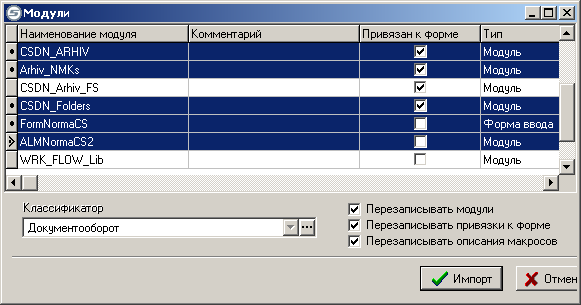 Для импорта необходимо в списке выделить нужные модули и нажать кнопку «Импорт».
