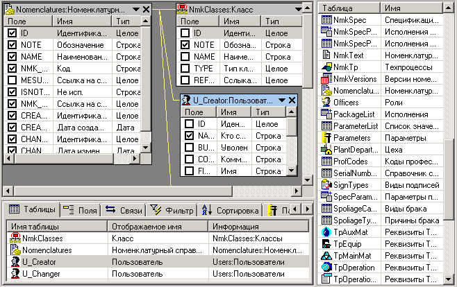 Содержит список созданных связей между таблицами. Позволяет изменить свойство