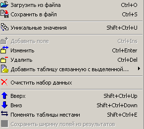 «Загрузить из файла» (Ctrl+O), «Сохранить в файл» (Ctrl+S) – вызывают процедуры экспорта/импорта наборов данных, как это показано в разделах 2.11.3 и 2.11.2 соответственно;
