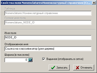 изменить имя поля, отображаемое имя поля, а также задать полю ширину в пикселях