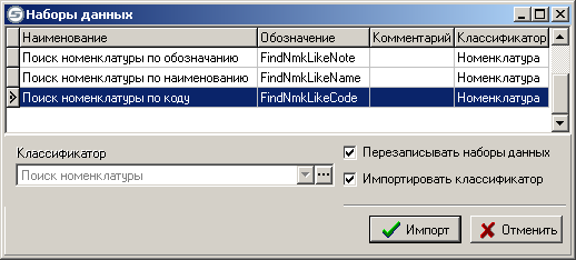 Для импорта необходимо в списке выделить нужные наборы данных и нажать кнопку «Импорт».
