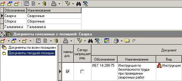 При выборе ветви «Документы по всем позициям» в правой части окна отображаются все документы, связанные со всеми позициями справочника, а при выборе «Документы текущей позиции», соответственно только документы, связанные с текущей позицией.