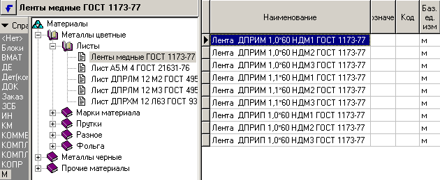 что в подгруппу «Ленты медные ГОСТ 1173-77», относящуюся к группе «Листы» из состава «Металлы цветные» справочника материалов, входят ленты от «Лента ДПРИМ 1,0*60 HДМ1 ГОСТ 1173-77» до «Лента ДПРИП 1,0*60 HДМ3 ГОСТ 1173-77». Если теперь в области редактирования выбрать раздел «Листы», то в информационном поле будут показаны все листы.