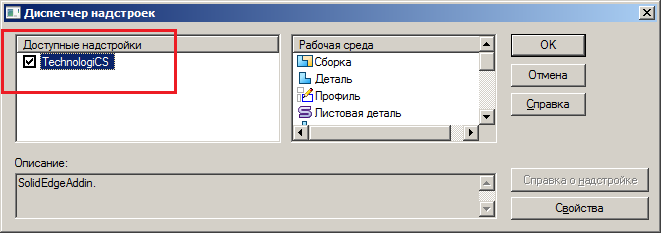 Для подключения CAD Communicator в главном меню выберите «Надстройки». В появившемся окне, в разделе «Доступные надстройки» проверьте, что установлен / установите флаг «TechnologiCS».