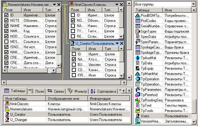· Рабочая область - область где отображены таблицы и связи, наложенные между ними.